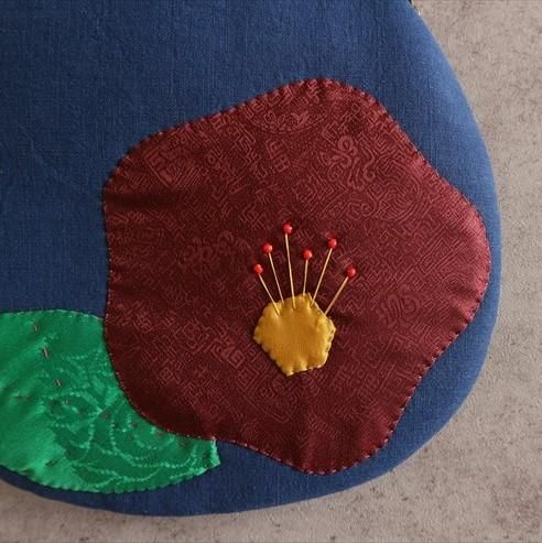 青のリネン布にエンジの花と緑の葉。花の布には形象文字のような模様が入っています。サイドの周囲にも中布の緑の布がチラリと見えアクセントになっています。