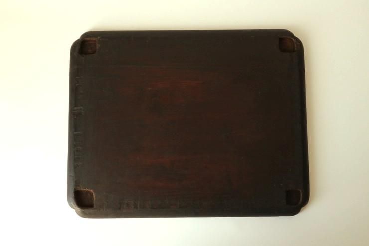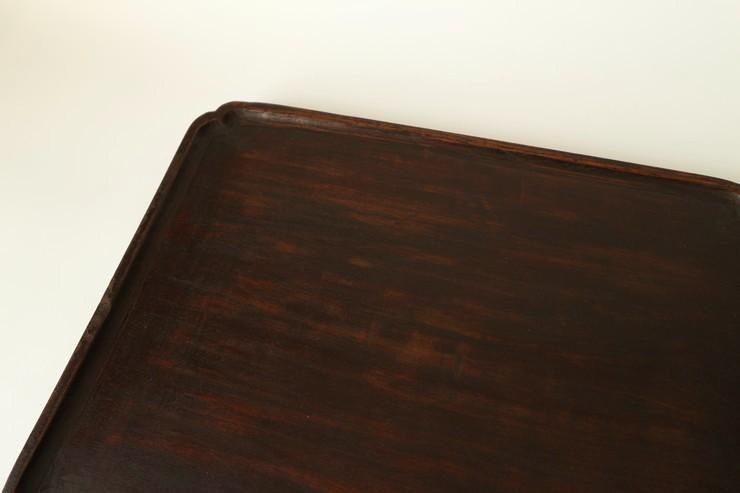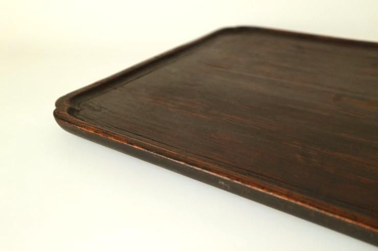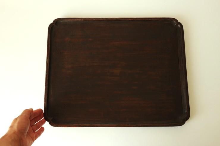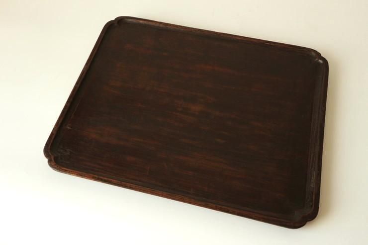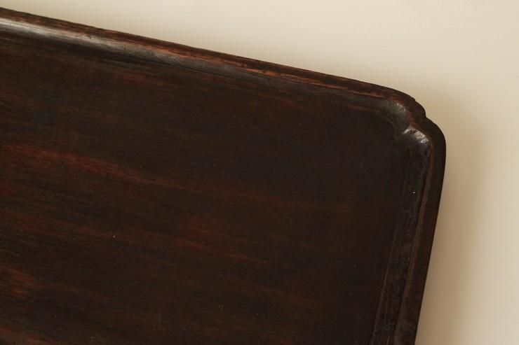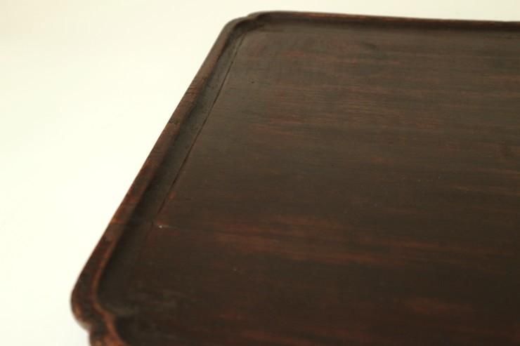 四隅に菱花の面取り加工がされ愛らしい趣をもつ造形です。縁がわずかに立ち上がり光沢がなく、塗装がおち赤茶の色が空間にすっと馴染むようです。片手で持つことがやっとの重さ。平行に木目がうっすら現れ、垂直に短い凹み傷が見受けられます。なじみと呼ばれる縁は黒ずみ、長年使われた印象があります。