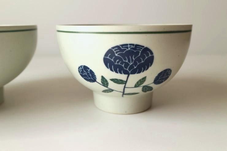落ち着いたマットな質感の白磁に、牡丹のイラストが描かれたお碗。