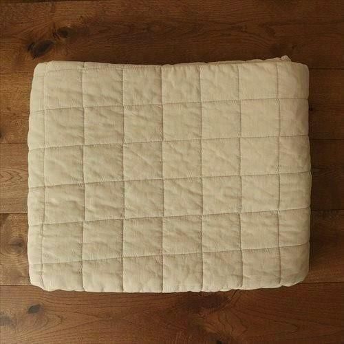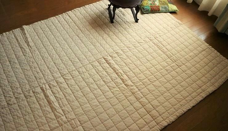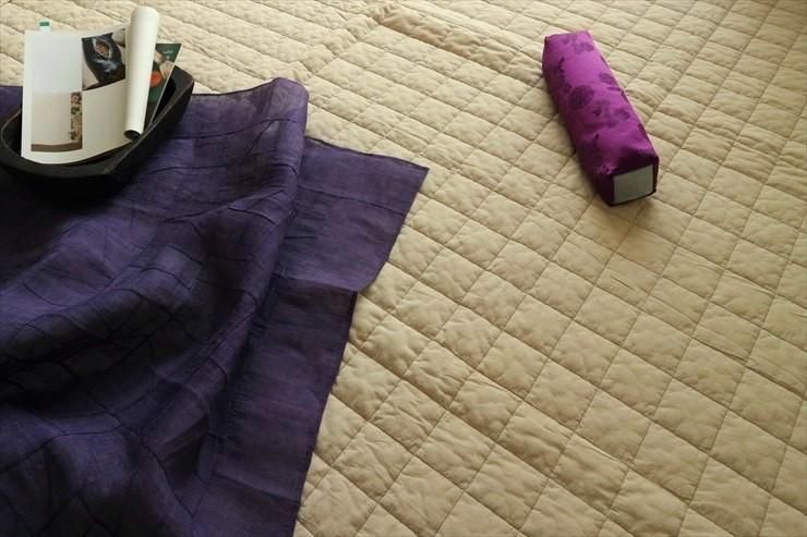 およそ6.5cm間隔のミシンステッチの正方形がきちんと並び、キルティングの間隔が広いため中綿のふーんわり感を実感していただきやすいイブルです。ふかふかとした手触り…ゴロンと寝転んでも痛くないです。